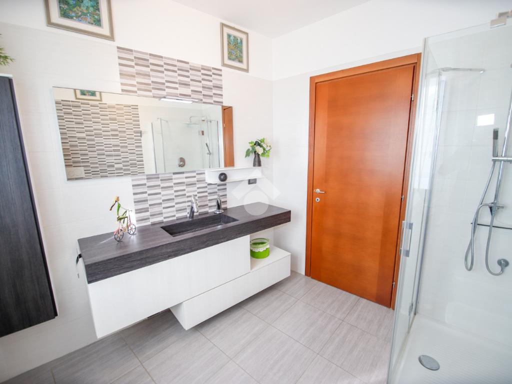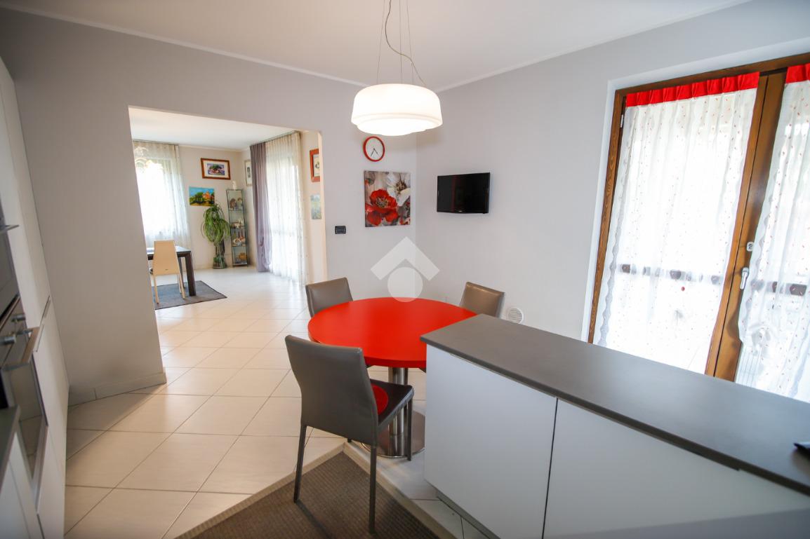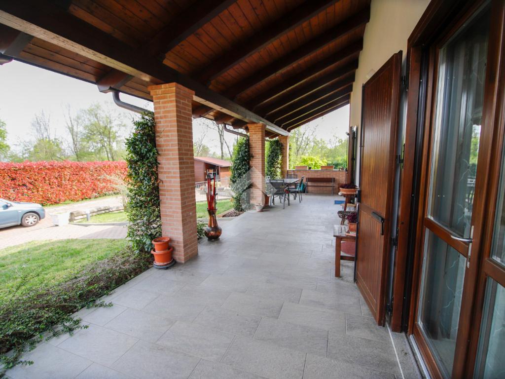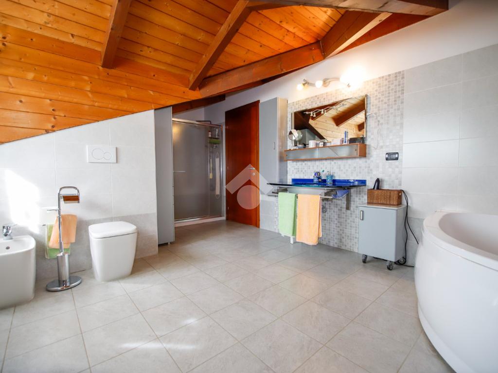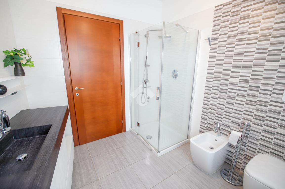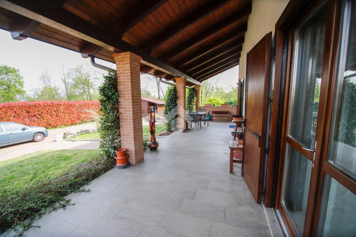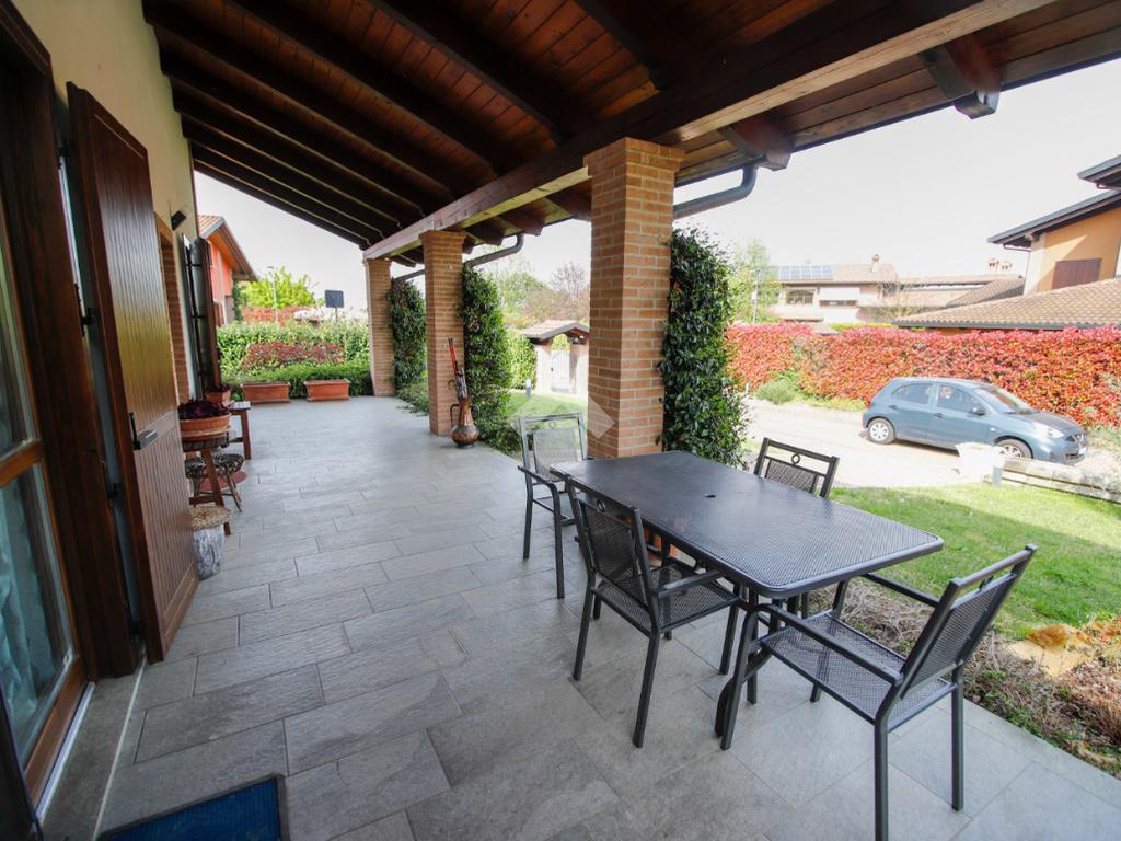 Il piano ospita inoltre una camera attualmente adibita a studio e un bagno con doccia. Completa il piano una funzionale lavanderia attrezzata, dotata di uscita su un balcone dedicato. Dalla scala in marmo si accede al primo piano dove si sviluppa la zona notte disposta da due ampie camere da letto, entrambe dotate di comoda cabina armadio, un bagno di generose dimensioni con vasca e un ripostiglio. Al piano interrato si trova un accogliente locale di sgombero adibito a tavernetta, un bagno con doccia e un comodo box auto doppio, dotato di basculante elettrificato e accesso tramite rampa rifinita in autobloccanti, oltre a un locale tecnico con caldaia a condensazione sostituita di recente. L’ampia area esterna comprende un pratico locale per attrezzi, ideale per la gestione del giardino, il cortile piantumato e il giardino privato che circonda l'intera villa. L'immobile è provvisto di impianto di irrigazione automatica suddiviso per zone, riscaldamento a pavimento differenziato per piano, sistema di antifurto planimetrico e volumetrico, pannelli solari dedicati alla produzione di acqua calda e passo carraio elettrificato.